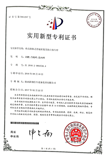 近日,陕西隆翔停车设备集团有限公司在原有基础上取得国家知识产权局颁发的“垂直滑移式带旋转装置的立体车库”等四项实用新型专利证书,目前公司共已取得发明专利及实用新型专利二十余项。
